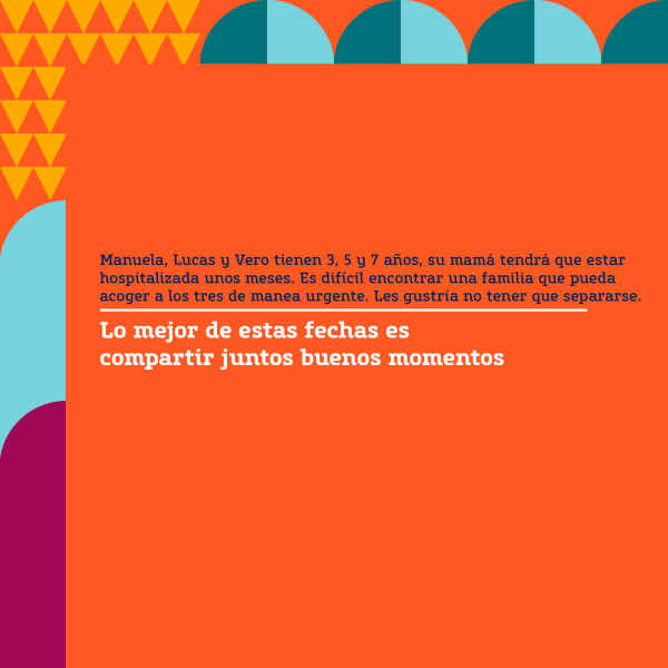 No obstante, no todos los niños y las niñas han vivido situaciones muy dramáticas. Otras veces puede ser que su madre tenga que ser hospitalizada y no tenga a alguien cerca que pueda cuidar de los niños y niñas todo el día. Podría ser el caso de Manuela, Lucas y Vero. Quizás su familia es de fuera o quizás pueden contar con la ayuda de unos abuelos, que son muy mayores, y solo se pueden quedar con ellos y ellas un ratito, pero no tienen la salud para poder cuidar a esos niños y niñas todo el tiempo. Si tú fueras esa madre ¿no te gustaría que tus hijos e hijas fueran con una familia de acogida?